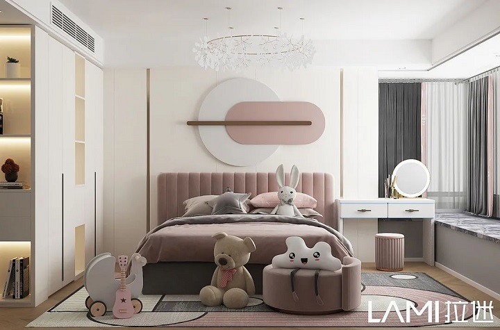 兒童房色彩搭配,拉迷一般采用幾款最接近大自然的板材:佩羅柏木、布格拉灰、伊麗莎白、絨面水藍等,色彩明亮、自然,對孩子的視力可以起到舒緩、放松。