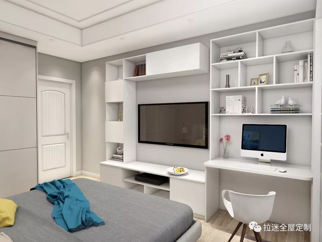 很多時候,在臥室里安裝電視柜是正對著床頭的。這個時候,如果僅僅安裝單個電視柜,就會顯得突兀。而在旁邊搭配一個梳妝臺或者書桌時,不僅大大加強實用性和收納空間,而且也能展示出臥室裝修的整體性。