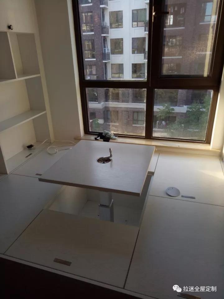 當然了,更值得一說的就是中間的那個升降臺。下降時就是一款面板,沒有什么出奇的地方,但升起變成一張桌子后,裹著被子,看書打牌追劇都可以,簡直是過冬最佳場所。