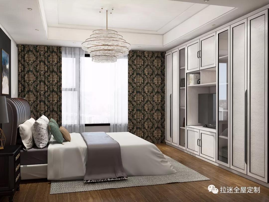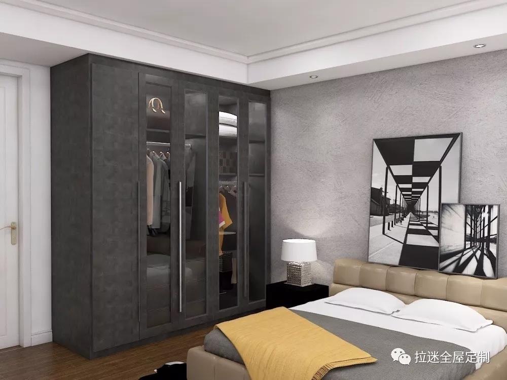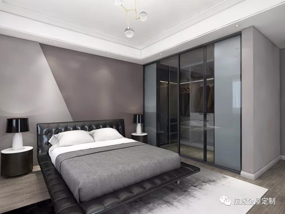 在床頭或床尾位置裝個(gè)定制衣柜,這樣可以達(dá)到非常巧妙的空間利用效果。