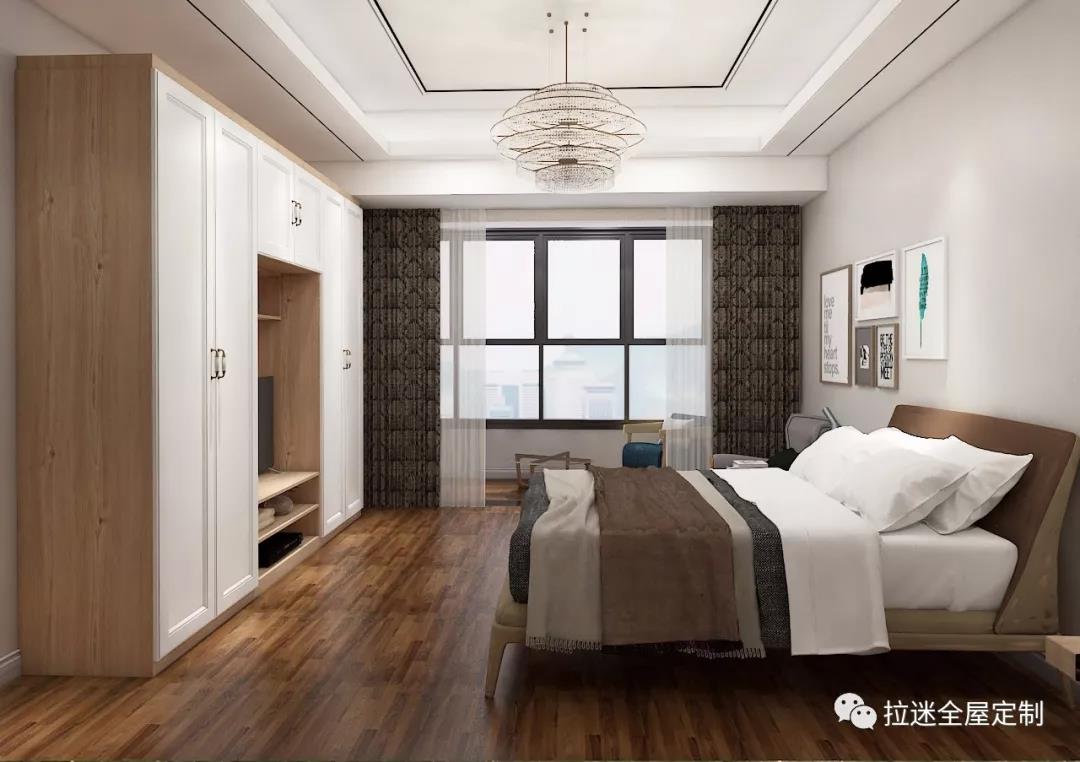 臥室寬度較大的,則可以在床的側(cè)邊擺放衣柜,如果寬度有限的話,則可以取消掉一個(gè)床頭柜,
