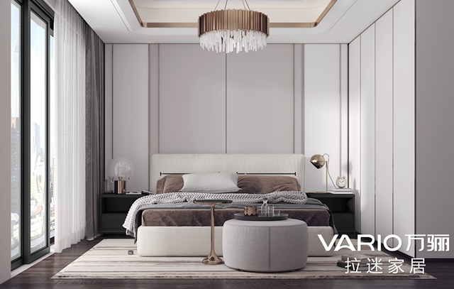 主臥要的就是簡潔大氣,一柜到頂不拼接,同色系背景墻點綴以金屬線條,溫馨中不乏時尚